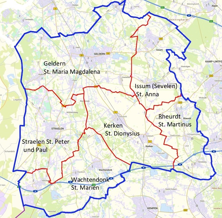 Seit dem 1. Januar 2024 bilden diese sechs Pfarreien den Pastoralen Raum Gelderland: